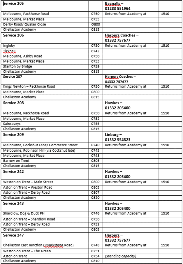 Details of school bus services to Chellaston Academy, including route numbers, service providers and expected timetables, are shown below.