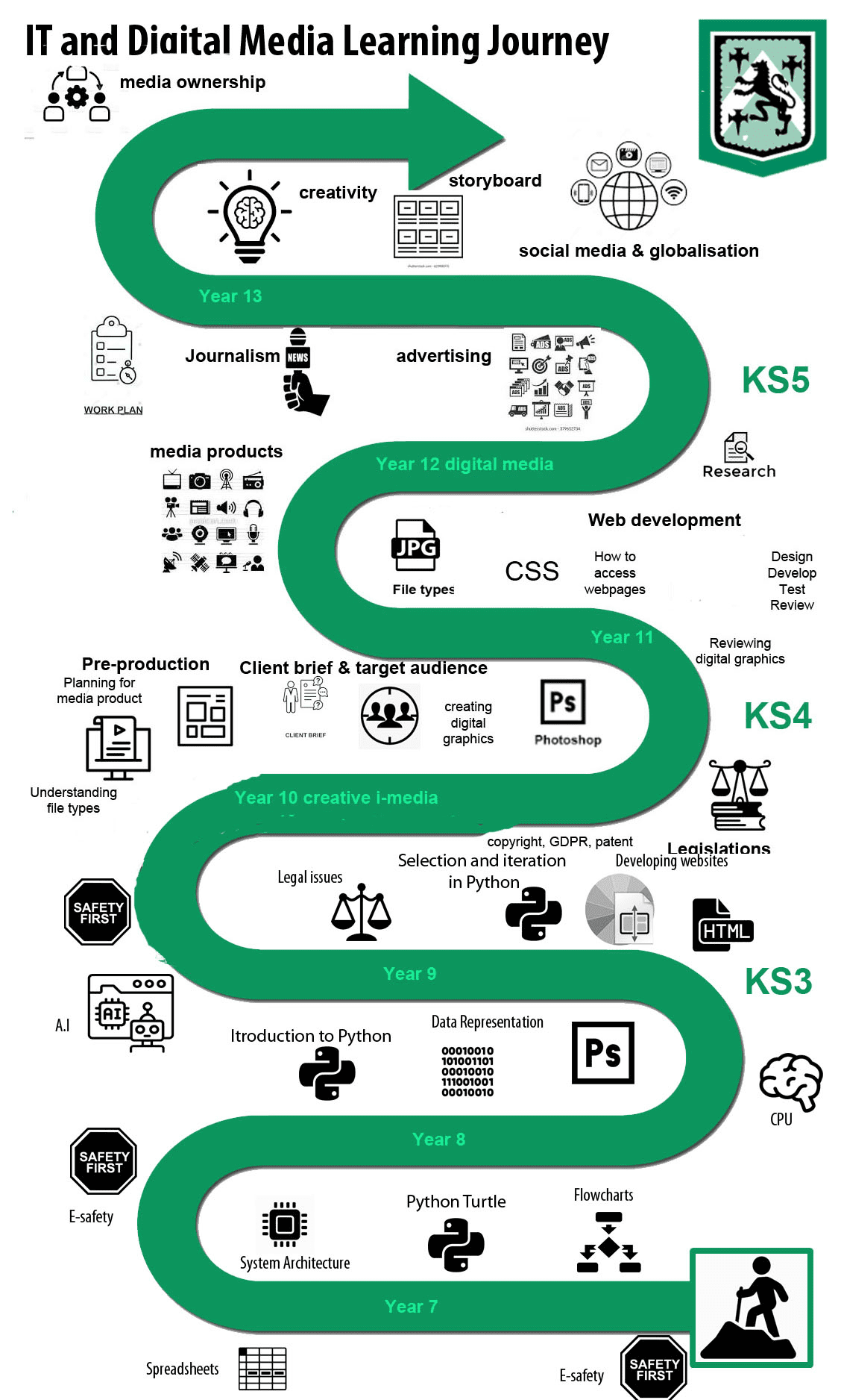 In ICT/ Computer Science, students will have developed skills to use computational thinking and creativity to understand and change the world. Computing has deep links with mathematics, science, and design and technology, and provides insights into both natural and artificial systems. The core of computing is computer science, in which pupils are taught the principles of information and computation, how digital systems work, and how to put this knowledge to use through programming. Building on this knowledge and understanding, pupils are equipped to use information technology to create programs, systems and a range of content. Computing also ensures that pupils become digitally literate able to use, and express themselves and develop their ideas through, information and communication technology, at a level suitable for the future workplace and as active participants in a digital world.