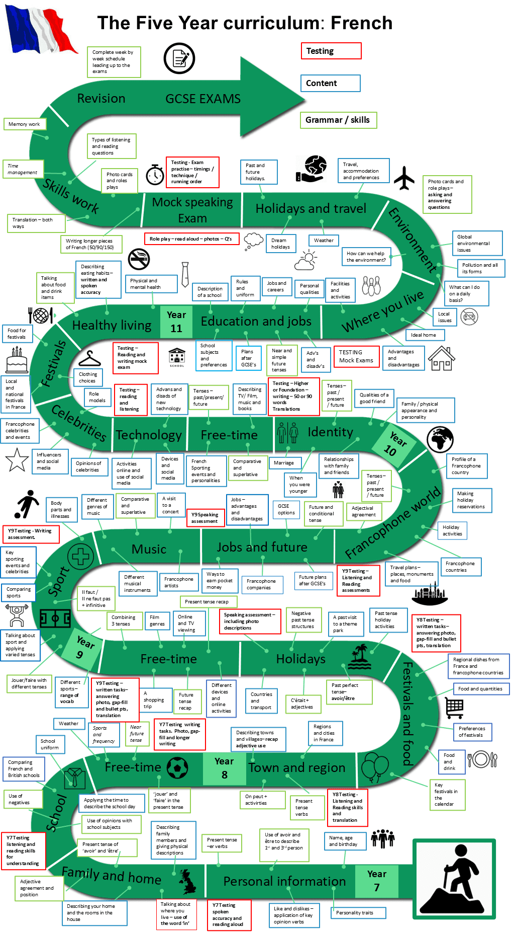 As they start their journey, students will develop their comprehension skills in listening and reading to a level where they are able to understand age appropriate notices and longer articles and texts on a range of topics. They will develop a working knowledge of grammatical structures within the language that enables them to write accurately, giving a personal response to a variety of stimuli within the context of the themes that are studied.